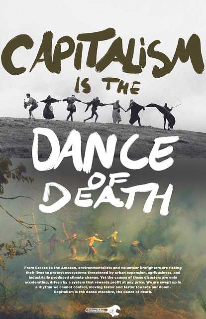 From Greece to the Amazon, environmentalists and volunteer firefighters are risking their lives to protect ecosystems threatened by urban expansion, agribusiness, and industrially produced climate change. Yet the causes of these disasters are only accelerating, driven by a system that rewards profit at any price. We are swept up in a rhythm we cannot control, moving faster and faster towards our doom. Capitalism is the danse macabre, the dance of death.